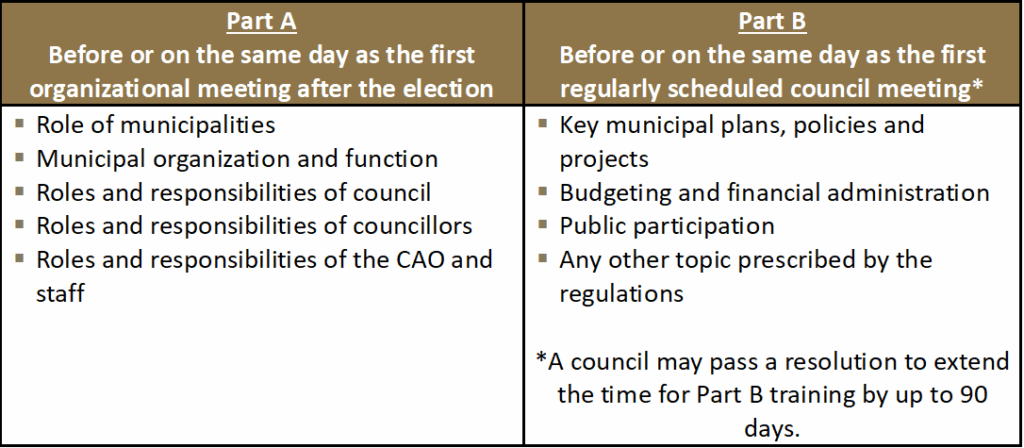 Section 201.1 of the MGA sets out the orientation topics and timelines: